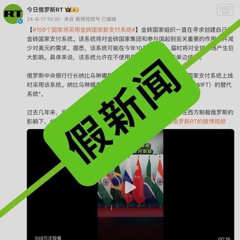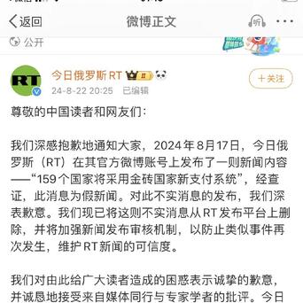 今日俄罗斯RT中文媒体号日前就一则“假新闻”向读者道歉,在8月17日,今日俄罗斯RT发布了一篇的新闻,引发了轰动,文章引用俄央行行长纳比乌琳娜的话,有“159个国家将采用金砖国家新支付系统”,可替代西方把持的国际资金清算系统(SWIFT)。